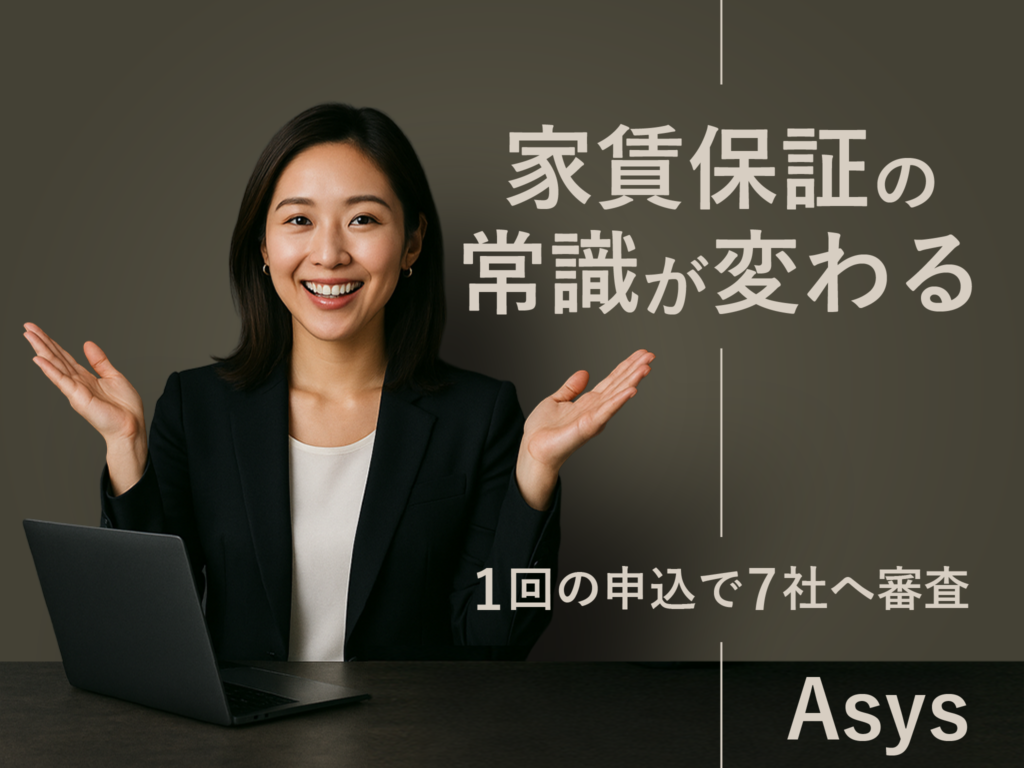 入居申込の審査が否認となる度に、管理会社は再申込、再説明などの大きな手戻りが発生します。アセス信用保証(大阪市)は、これらの業務負担を削減するため、次世代の共同保証型プラットフォーム「Asys(エイシス)」*を開発しました。管理会社は、1回の入居審査申込で、複数の保証会社から順次審査を受けることができます。複数社の基準を横断して審査が進むため、承認の可能性が広がり、入居付けの機会損失を減らします。*特許申請中