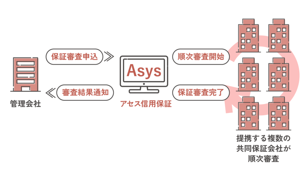「Asys」は、アセス信用保証が考案した“共同保証事業”を実現する新たな審査プラットフォームです。共同保証事業とは、アセス信用保証および、同社と業務提携をする複数の保証会社が、共同で入居審査に対応する仕組みです。管理会社は、従来のように、審査の否認ごとに申込をやり直すことがありません。1回の申込で、最大7社の保証会社から順次、自動で審査を受けることができます。